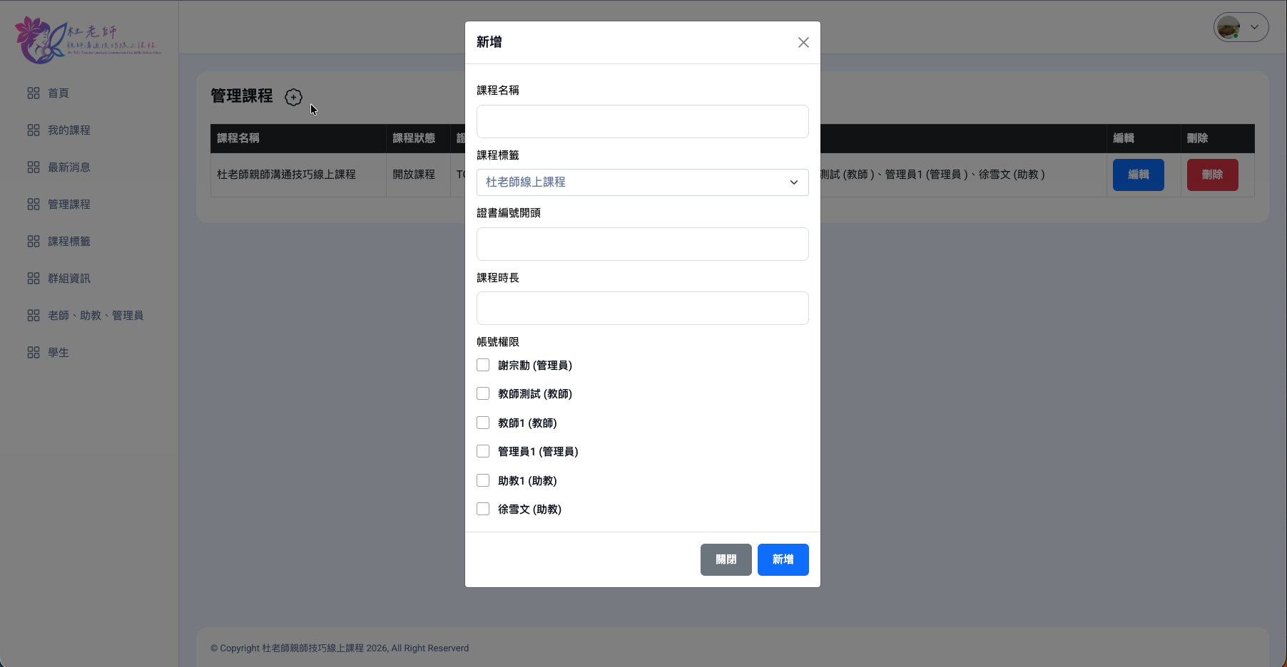 新增課程並指派給教師